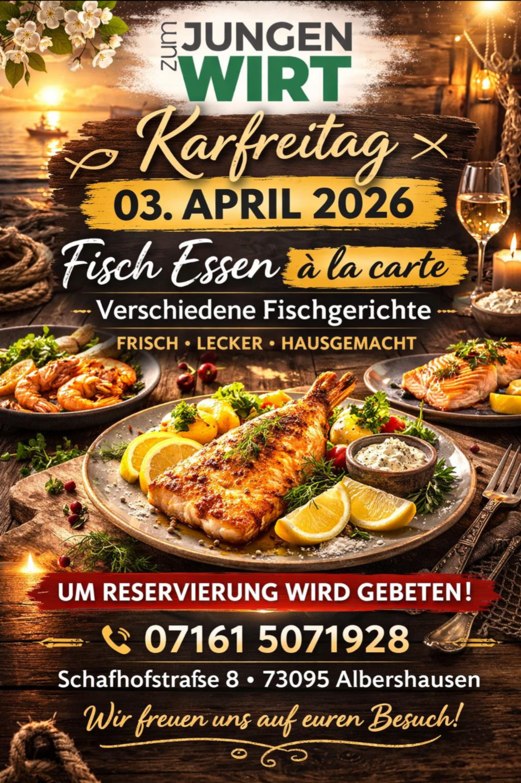 Herzliche Einladung zum Fisch - Essen am Karfreitag, den 03.04.2026 Verschiedene Fisch - Gerichte à la carte Bitte um Reservierung unter 07161 507 1928